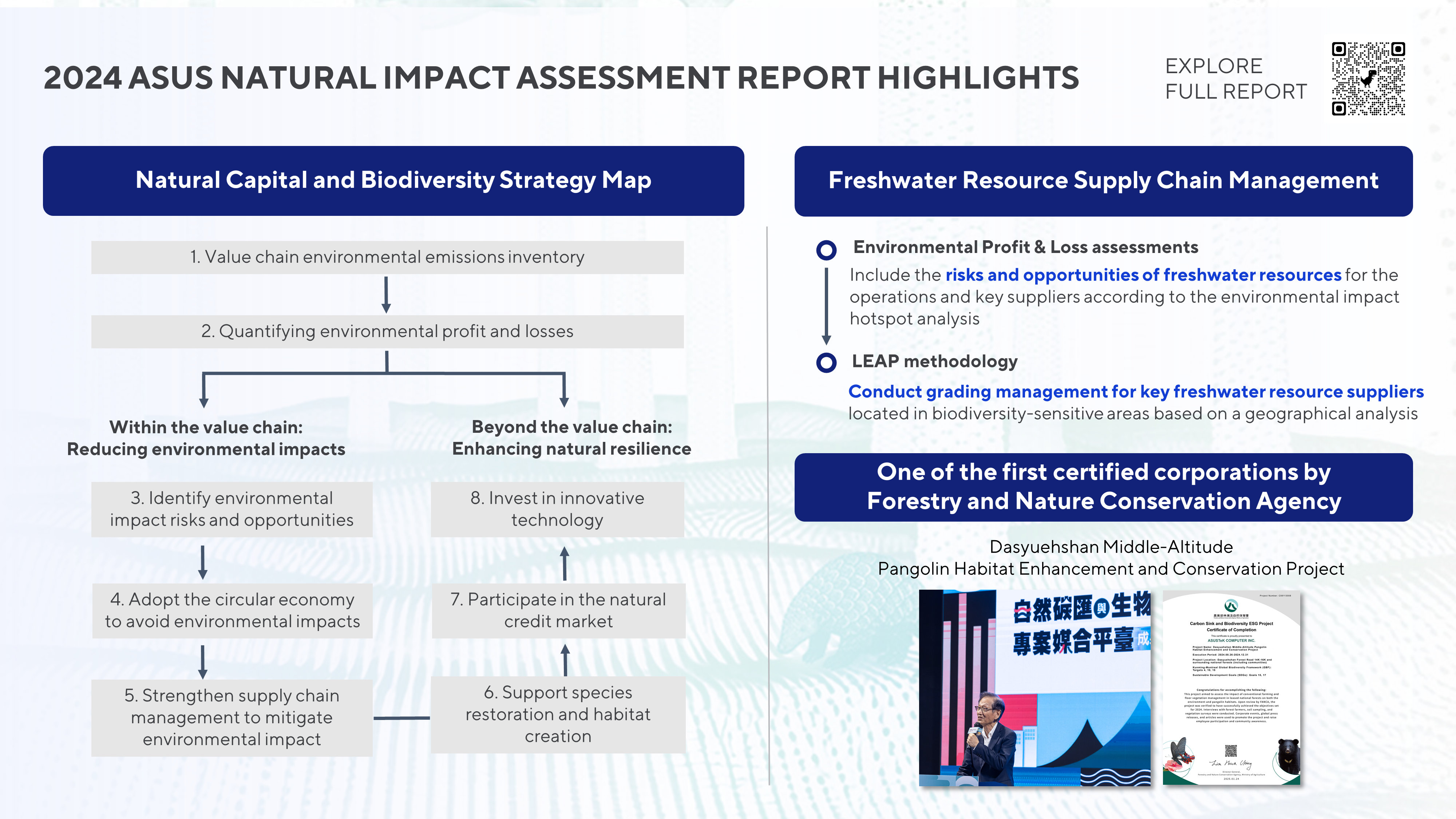 ASUS has published its "2024 Natural Impact Assessment Report," outlining a strategic roadmap for natural capital and biodiversity based on eight key actions encompassing both value chain management and external initiatives. The process begins with a value chain environmental footprint data assessment, followed by an environmental profit and loss (EP&L) analysis to identify environmental impact hotspots. Within value chain management is then implemented to mitigate these impacts. Through circular economy initiatives and supply chain management, particularly concerning freshwater resource management within the value chain, ASUS further analyzes whether key supplier locations are situated in internationally or nationally recognized biodiversity hotspots. Identified suppliers located near critical biodiversity areas will be subject to grading management and enhanced auditing to reduce the impact of water pollution leading to effective water resource depletion. Externally, ASUS is responding to international nature-positive initiatives by engaging in species restoration and habitat creation projects. Looking ahead, ASUS will monitor international trends, participate in natural capital credit markets, and explore innovative technologies to discover new technological solutions for nature.